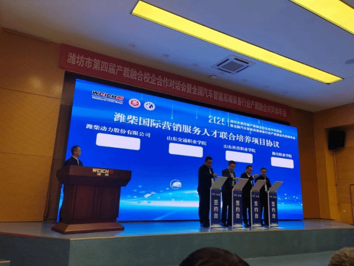 会上,15vip太阳集团主要负责人与潍柴动力股份有限公司、山东交通职业学院、山东科技职业学院代表共同签署了国际营销服务人才联合培养项目协议。根据协议,将采用“学校理论学习+潍柴大学理实一体化学习+潍柴岗位实习”三段式培养模式,校企共同制定培养方案、共建课程体系,为企业定向培养具备国际视野的营销服务人才。潍柴将为考核合格毕业生提供就业岗位,实现人才培养与就业的有效对接。