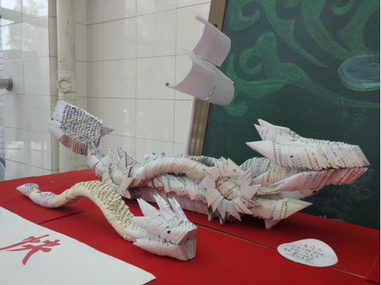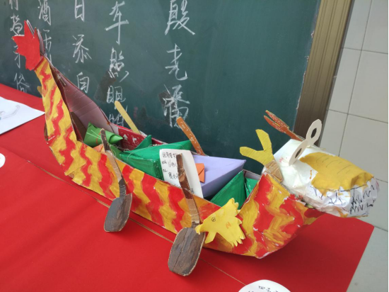 活动中同学们耐心地将一片薄薄的卡纸折成三角形状的龙舟骨架,将骨架一片一片穿插起来制作成龙舟的身体和头尾。相同的卡纸相互搭配在一起,错落有致,形成不同的部件。最后,再将它们一一组装起来,用彩纸包装一次性筷子设计成旗杆和旗帜插在龙舟中央,一艘纸质龙舟就完成了。